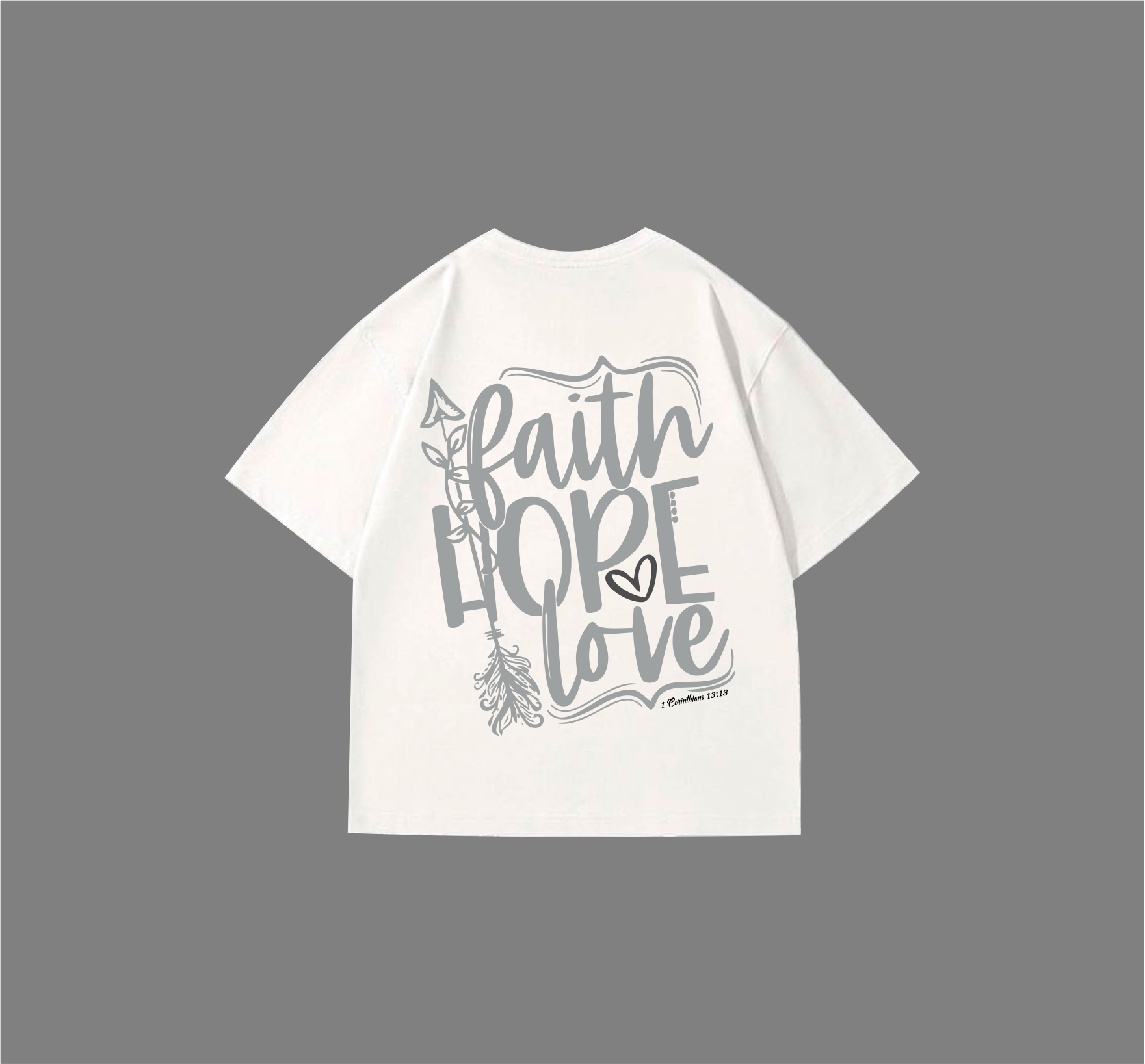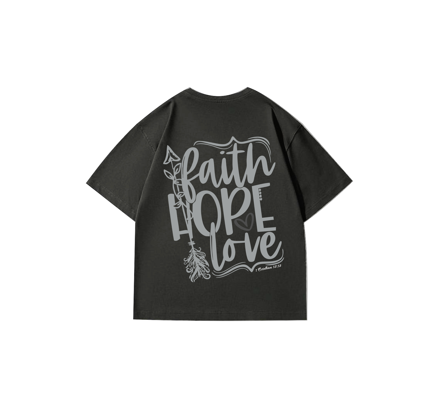 The Faith, Hope, Love Tee carries the essence of everything we stand for. Inspired by 1 Corinthians 13:13, it’s a visual declaration of the values that sustain us — faith to keep walking, hope to keep fighting, and love that never fails.